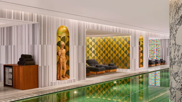 1884年にローマで創業したブルガリがその本拠地に開業した9番目のホテル(かつフラッグシップ)は、ローマ帝国の壮麗さを堂々と讃えています。このホテルは、ローマ帝国初代皇帝・アウグストゥスの霊廟の目の前に建ち、ホテルの入り口では皇帝アウグストゥスのオリジナルの彫刻がお出迎え。1930年に建築家のヴィットリオ・バリオ・モルプルゴが手がけた建物は、伝統的な建築資材や色を用いた合理主義的な近代建築で、それ自体が宝石のようです。モザイクや、オフホワイトからグリーン、ゴールドまで幅広い色みの大理石が至る所に使われており、部屋のライトは黄金色で、スパは古代ローマ浴場の雰囲気を再現しています。