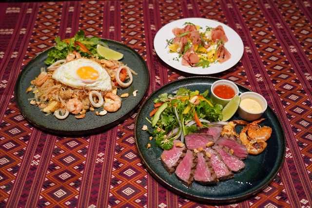 タイ産のマンゴーを使った「タイ産マンゴーと14ヵ月熟成ハモンセラーノのアペリティフ」869円(税込)や、タイ発祥のシラチャーソースを組み込んだ「銘柄黒毛和牛ウチモモと海老、シラチャーマヨのエスニック風ステーキサラダ」2,849円(税込)など、全5品の限定メニューを楽しむことができます。