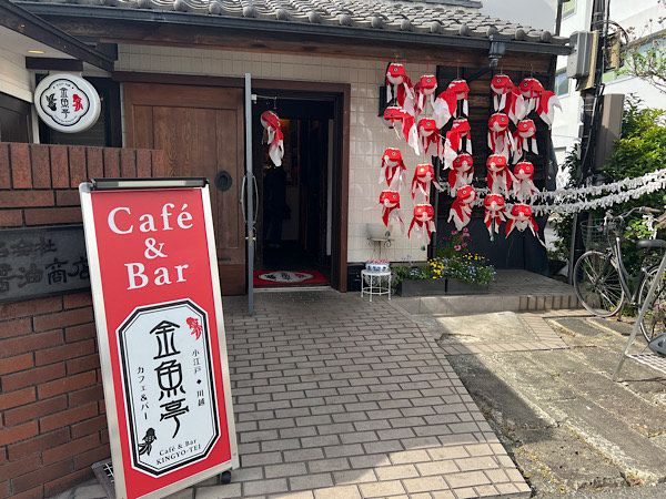 前々からチェックしていた『金魚亭(きんぎょてい)』で一服。メイン通りからは少し外れた場所にある、蔵を改装したカフェ&バーです。テラス席は犬連れで過ごすことができたので、ありがたかったです。(テラスはお店の中を通って奥にあります)