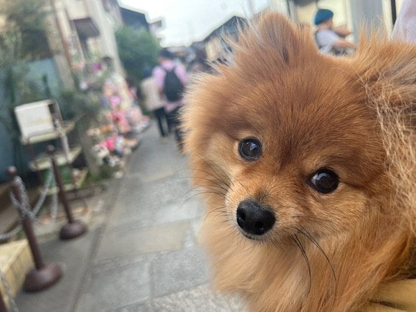 前半で6,000歩、たっぷり川越の歴史を感じたら、後半戦に突入です。川越一番街の北側の端に到着した私たち。通りにはインバウンドの観光客も増え、かなり賑わっていました。道幅も狭いので、愛犬はここから抱っこして散策をはじめます。
