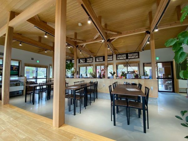 奥が、カフェスペースです。木の温もりのある、明るい雰囲気の中で過ごせます。
