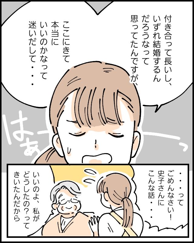 「はぁーっ、付き合って長いし、いずれ結婚するんだろうなって思ってたんですが、ここにきて『本当にいいのかな』って迷いだして・・」