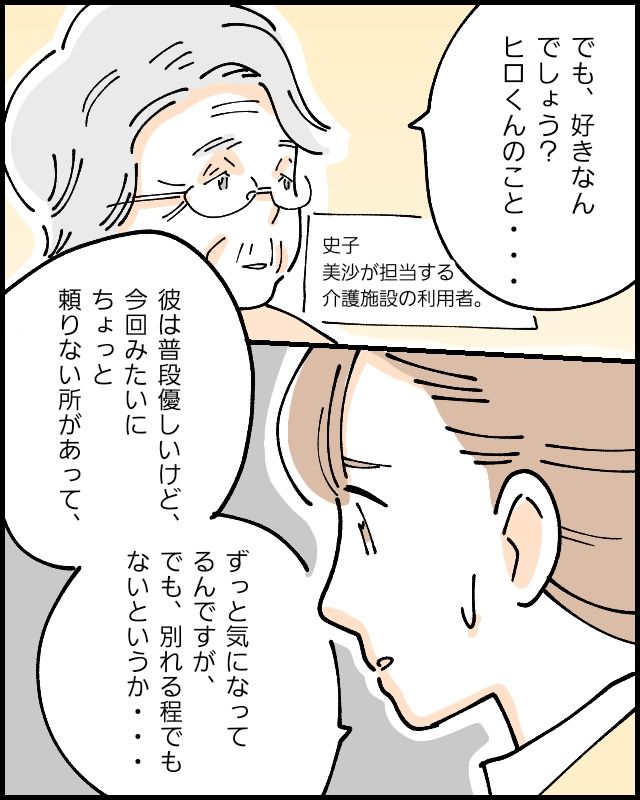 介護士として働き始めて2年目の美沙さん、学生時代から付き合っている彼ヒロさんがいて結婚も考えてはいるものの、彼の実家に挨拶に行った時に「結婚したら仕事はやめてもらう」「元介護士だから老後は安心」だと言われモヤモヤが・・