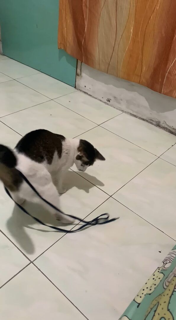 自分のしっぽにひっかかった靴ひもを追いかけ、その場でグルグル回転している猫。