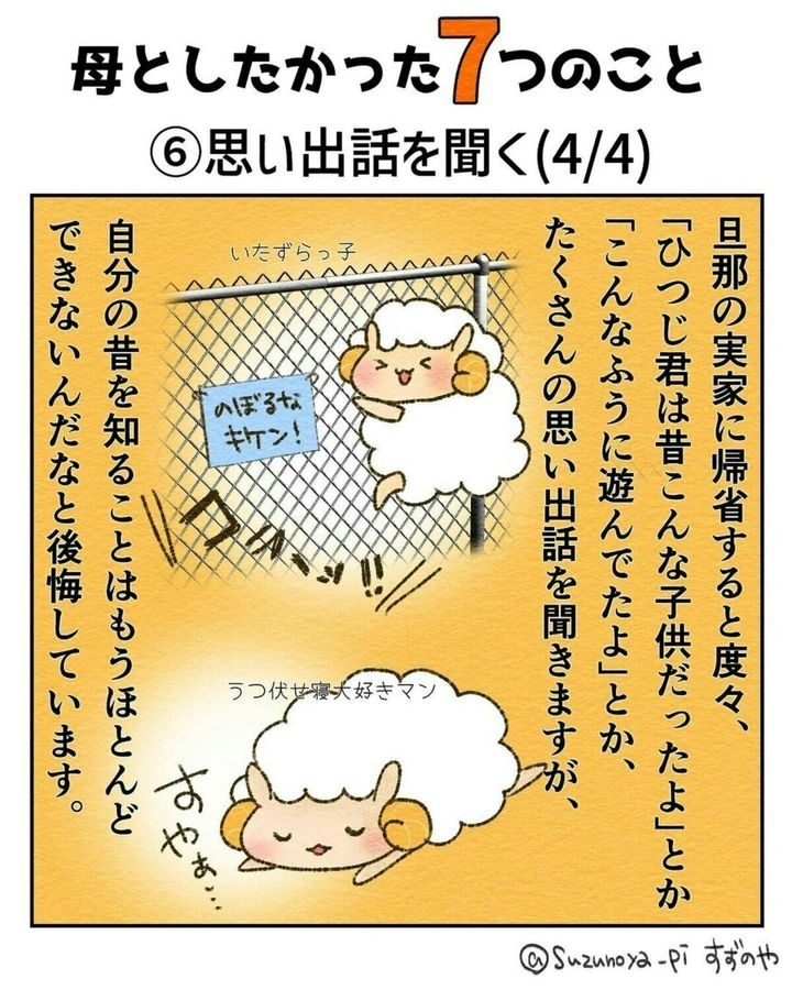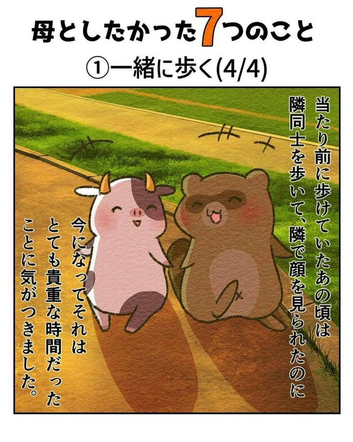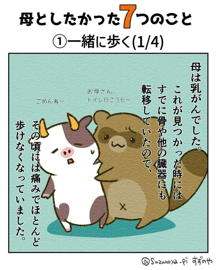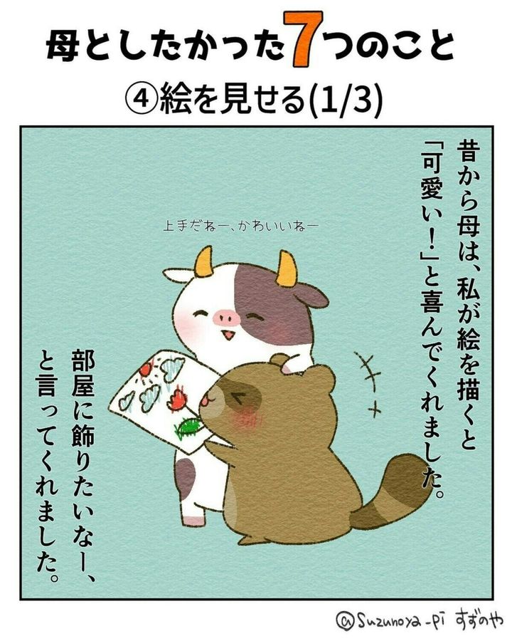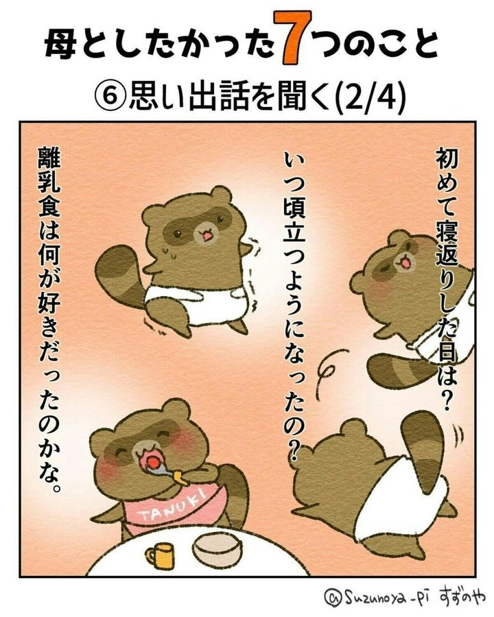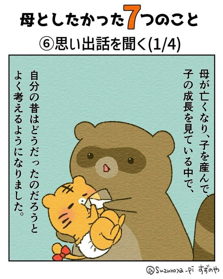 皆さんにとって親とはどんな存在ですか?厳しくもあり、優しくもあり…。「たくさん迷惑をかけたから頭があらない」なんて人もいるかもしれませんね。また、自分が親になってから改めて尊敬することが増えた人もいるかもしれませんね。今回ご紹介する作品はすずのや∵たぬきママと愉快な家族の育児漫画(@suzunoya_pi)さんが母を亡くした時のことを描いたエピソードです。『母としたかった7つのこと』をダイジェストでご紹介します。