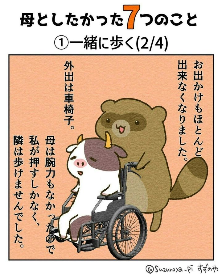 車いすの生活になった母…。母と散歩をしていたすずのやさんは、ふと、ならんで歩いていたころをなつかしく感じると同時に、貴重な時間だったと実感するのでした。