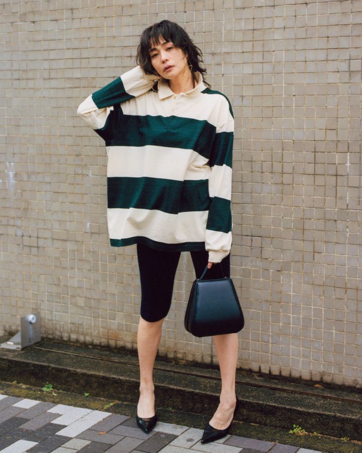 ミニマムなボトム選びとレディな足元で女らしく。 ラガーシャツ※ユニセックス[SIZE:3]¥26,400(ブラームス ルーツストック/ワンダリズム)、レギンスパンツ¥22,000(フィーニー)、ピアス¥45,100(バー ジュエリー/エルディスト)、バッグ¥56,100(アーカイブエプク/UTS PR)、パンプス¥35,200(ピッピシック/ベイジュ)