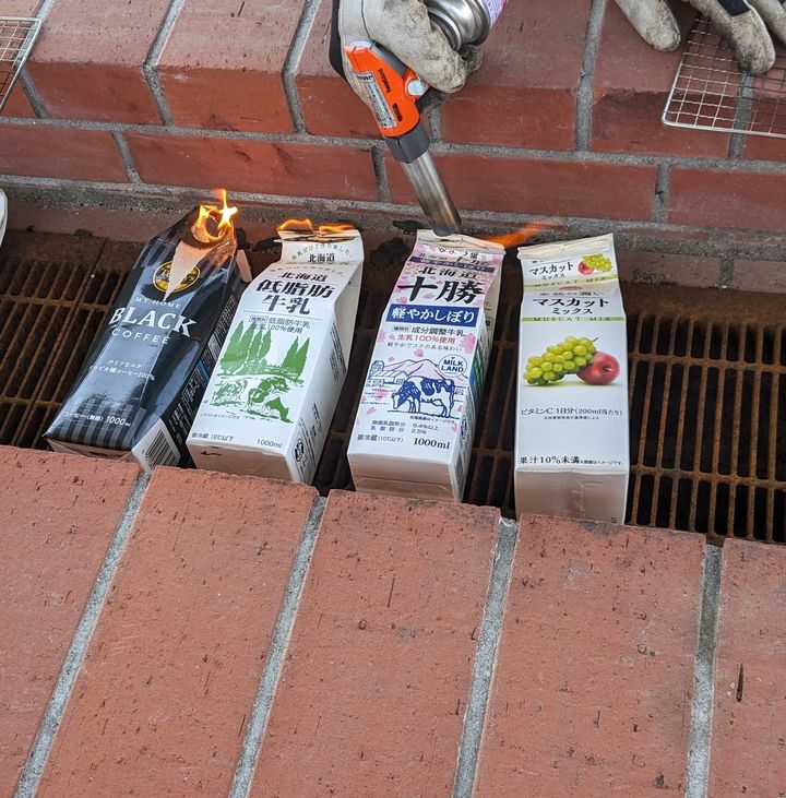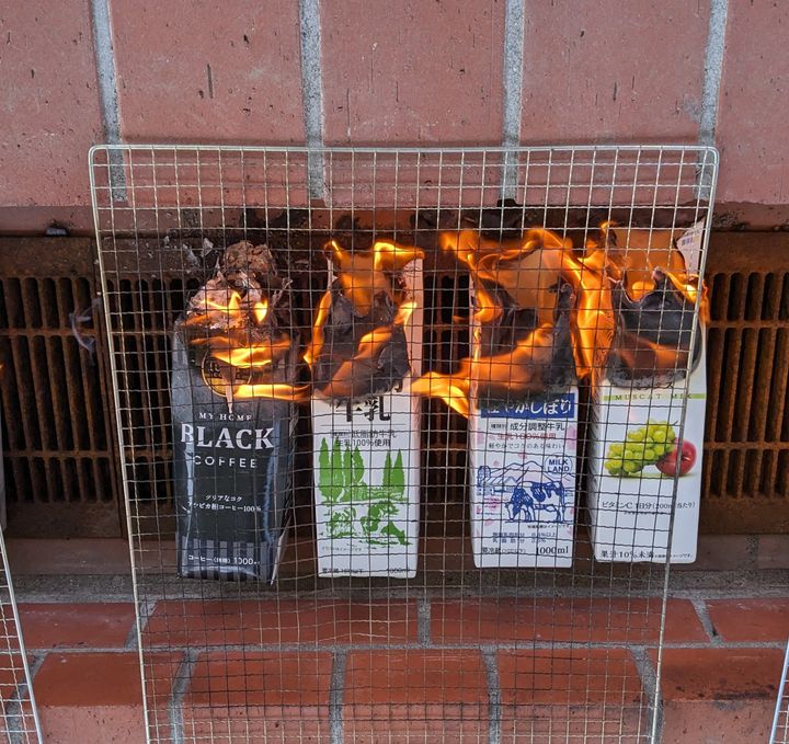 火が燃え尽きるまでの約10分ほどの間、子ども達も火がついてパックが燃えていく様子を興味津々で見ていました。