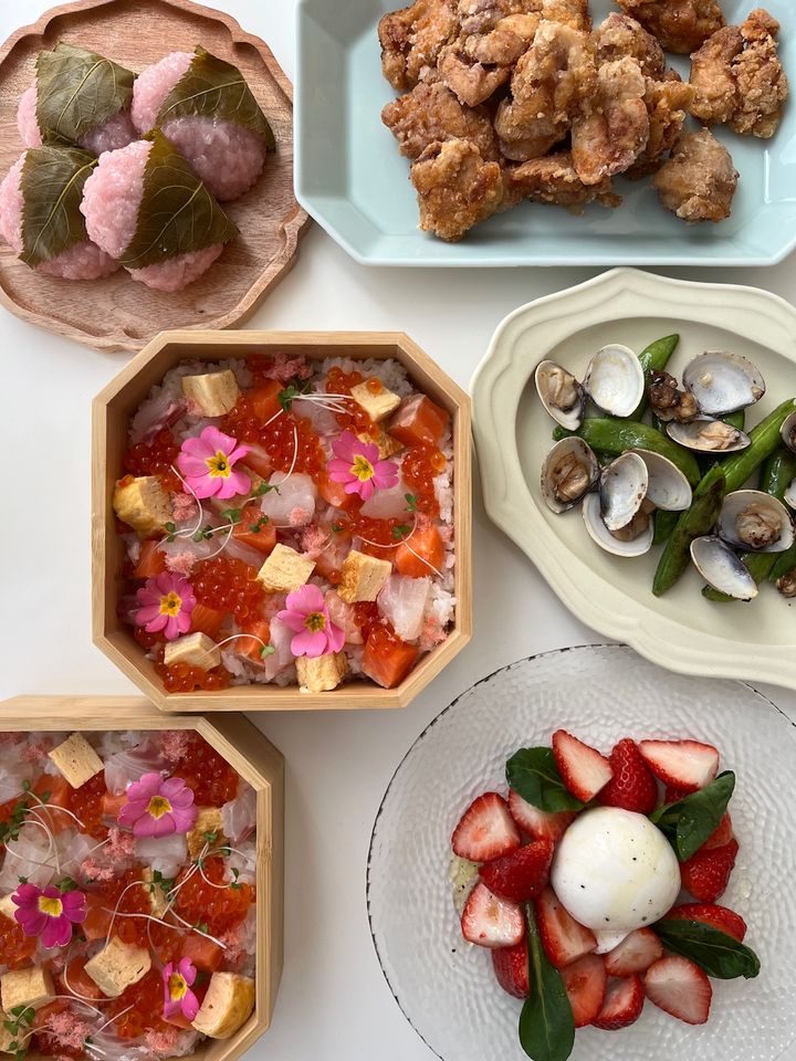[番外編]今年のひな祭りは海鮮ちらし寿司と蛤とスナップエンドウのバターソテー、イチゴとブッラータのカプレーゼ、鶏の唐揚げ。竹製の重箱は3coinsで購入しました。