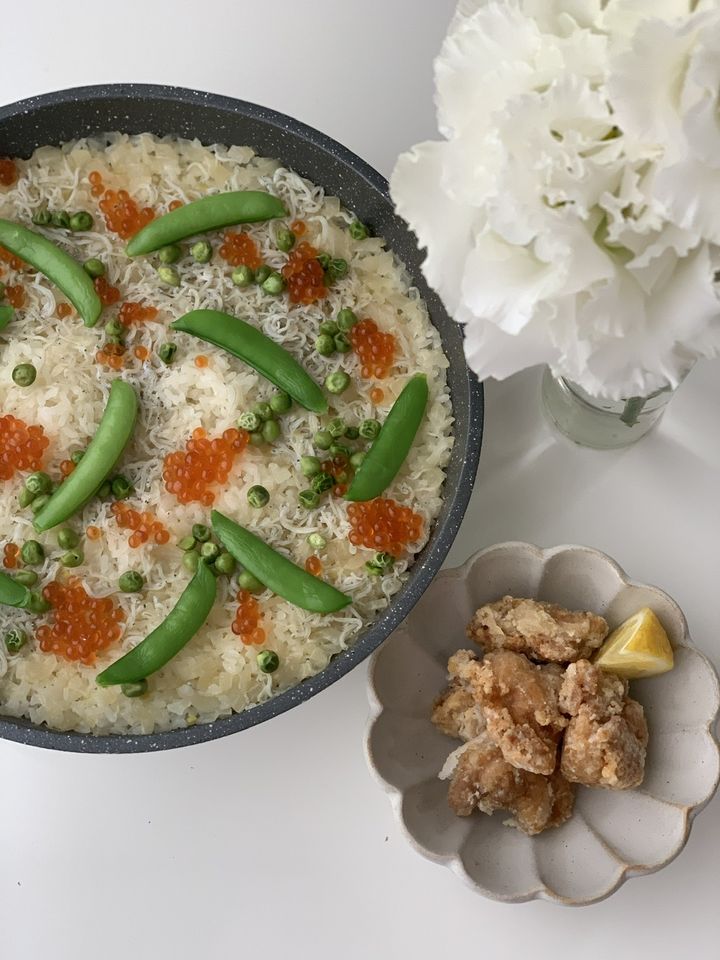 2021年のメニューはしらすとスナップエンドウのピラフ、鶏の唐揚げ。
