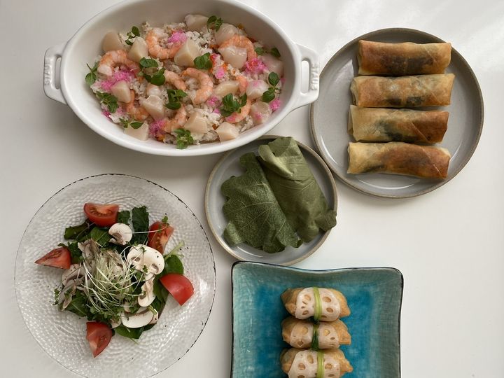 2022年のメニューは帆立と海老のちらし寿司、春巻き、いなり寿司、マッシュルームとグリーンリーフのサラダ。