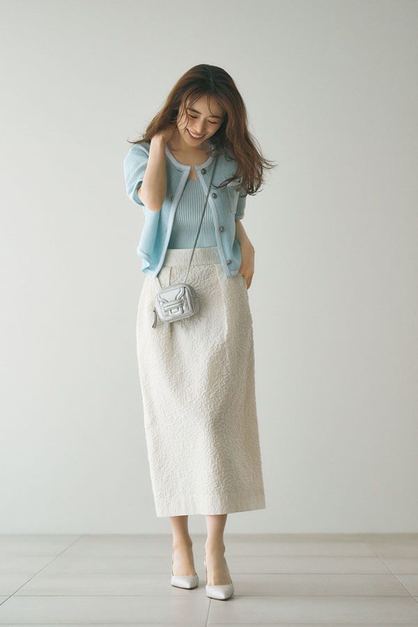 水色×ホワイトの爽やか配色で春気分♡ さりげなく織り込まれたスパンコールでスパイスをひとさじ。インナーのニットはINしてウエストまわりをすっきりと見せて。