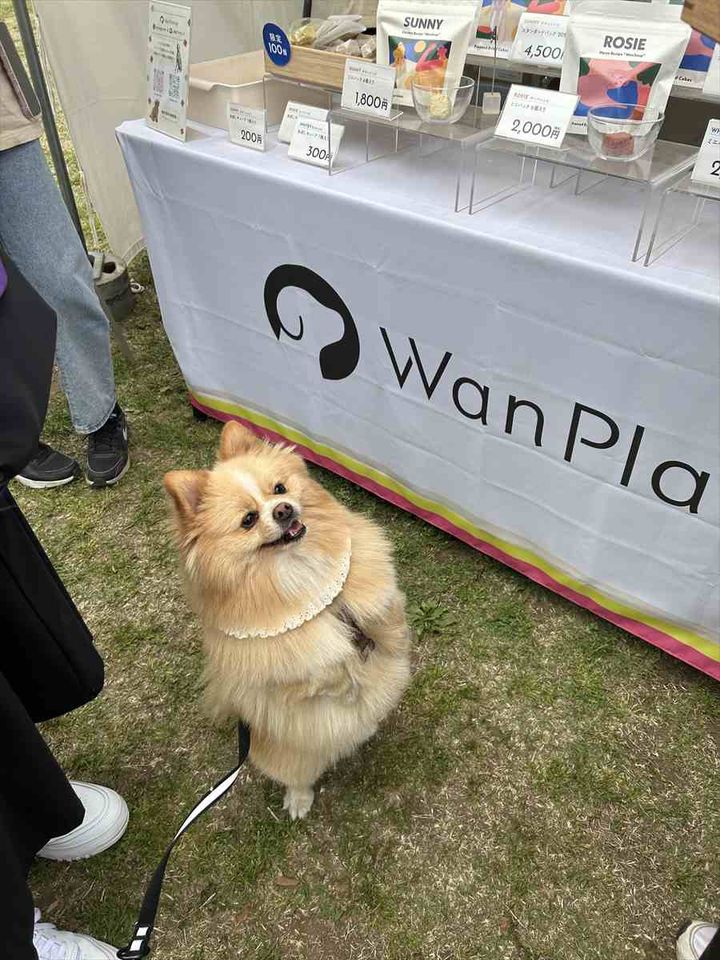 飼い主さんの隣で真剣な眼差しを向けるポメラニアン。 オヤツ屋さんの説明をじっと聞いているように見えますが・・・、この行動にはある意図があったのです!!