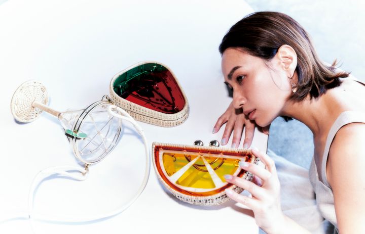 いちごバッグ¥100,100、オレンジバッグ¥72,600、グラスバッグ¥72,600(全てワイ ワイ/ユナイテッドアローズ 原宿本店)、ドレス¥36,960(アンクレイヴ ホワイト/アンクレイヴ)、ピアス¥12,100(シシ ジョイア/シティショップ)
