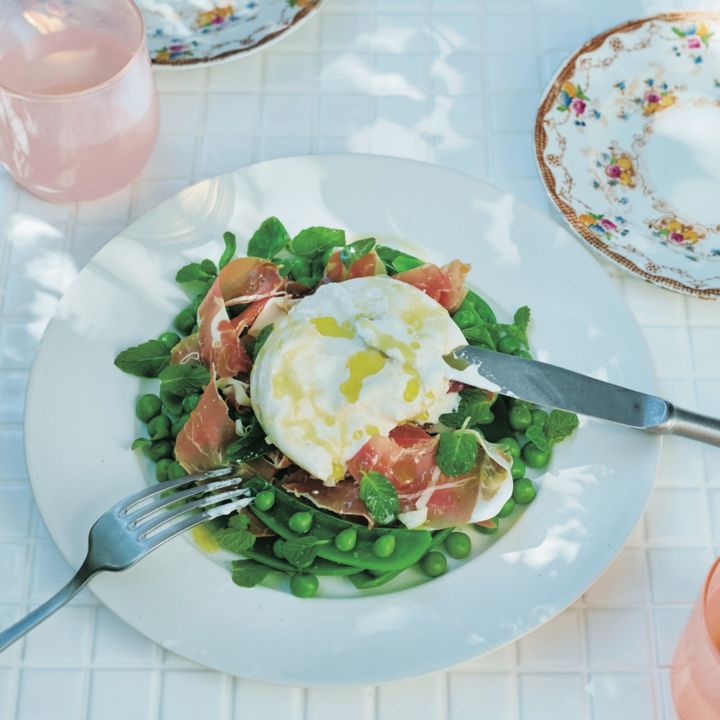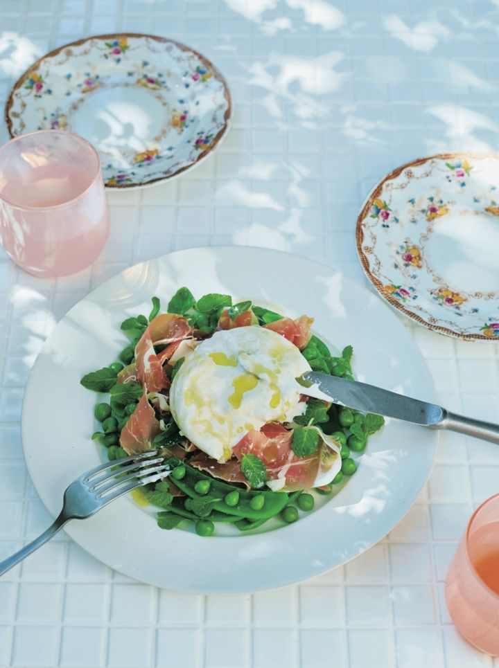 器にを広げて盛り、生ハム、ミント、ブッラータチーズをのせる。オリーブ油を回しかけ、チーズを崩して塩をひとつまみふる。
