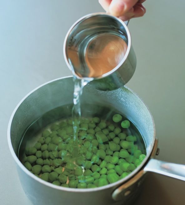 POINT グリーンピースはゆでたあと、水を少しずつ加えながら湯の中で徐々に冷まして。ざるに上げて急冷すると、シワがよりやすくなる。