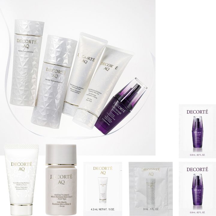 毛穴・乾燥・くすみをオフしてツヤ肌へ導くコスデコの最上級ラインをたっぷり試せます!洗顔料 ミニチューブ 10g、乳液 ミニボトル 14ml、クレンジング・化粧水 パウチ各1包、美容液 パウチ2包
