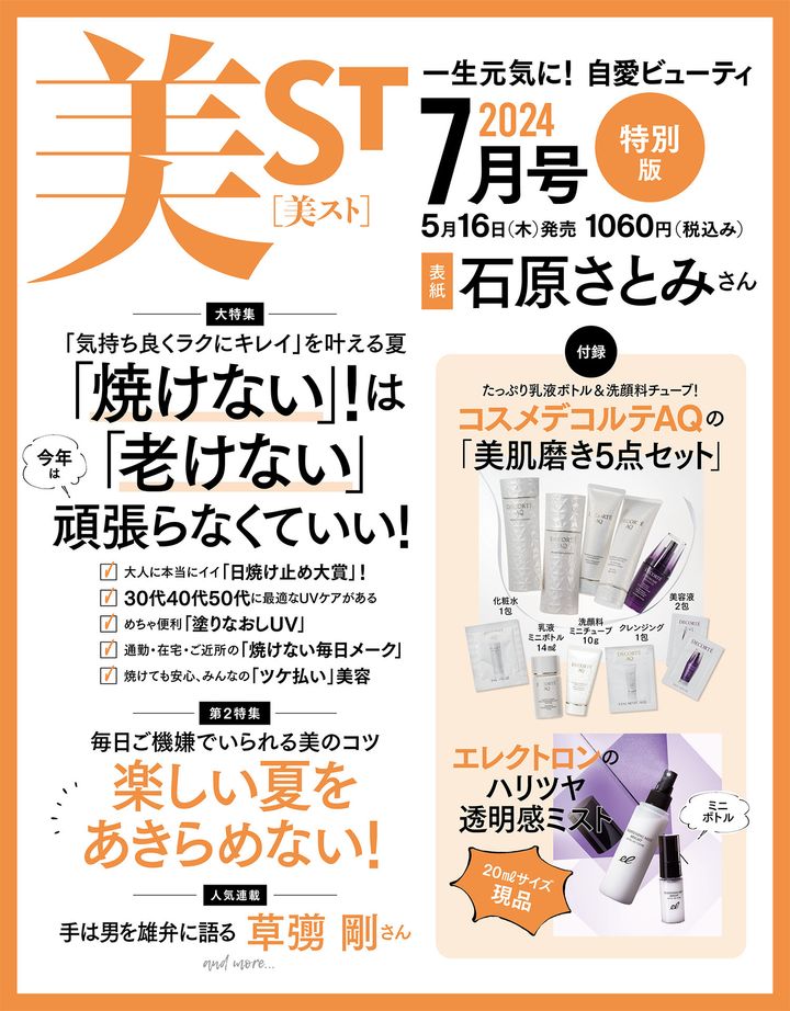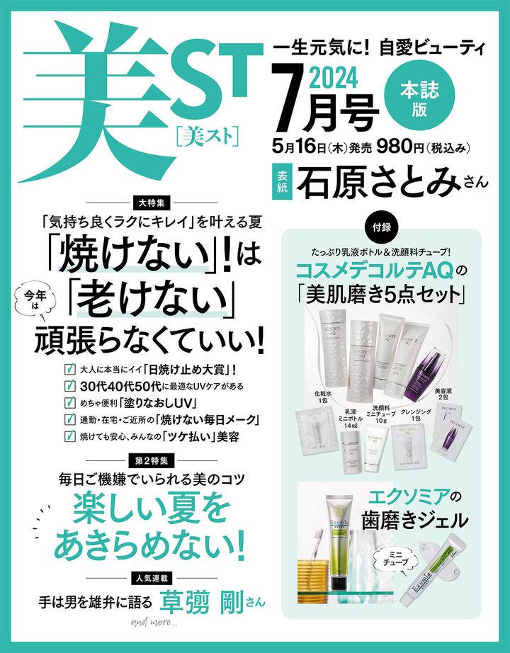 5月16日(木)発売・美ST7月号のネット書店での予約受付が始まりました!石原さとみさんが美ST初表紙を飾ります!付録は、たっぷりボトル&チューブのコスメデコルテ AQ「美肌磨き5点セット」や、エレクトロンの透明感ミストが現品で付く超豪華仕様です!完売必至の早い者勝ちなので、ぜひお早めの予約を!