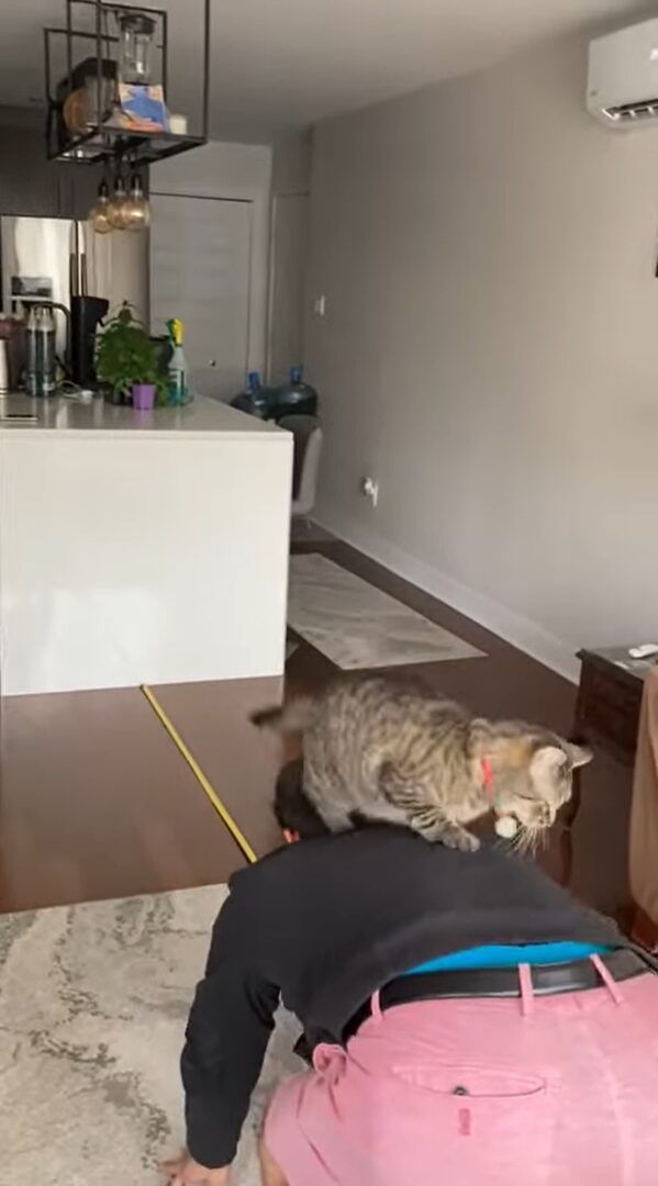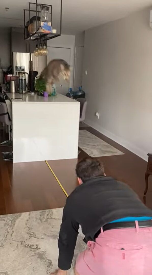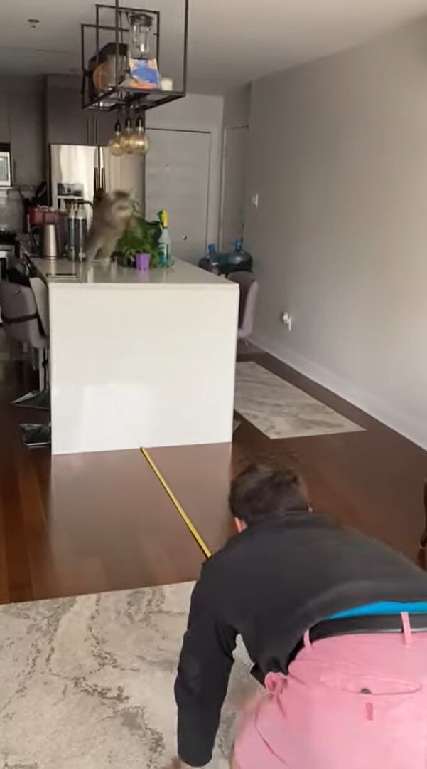 キッチンにいるこの子が、これからスゴ技を披露してくれますよ。 うずくまっている飼い主さんは、床にセッティングしたメジャーをじっとチェックしています。