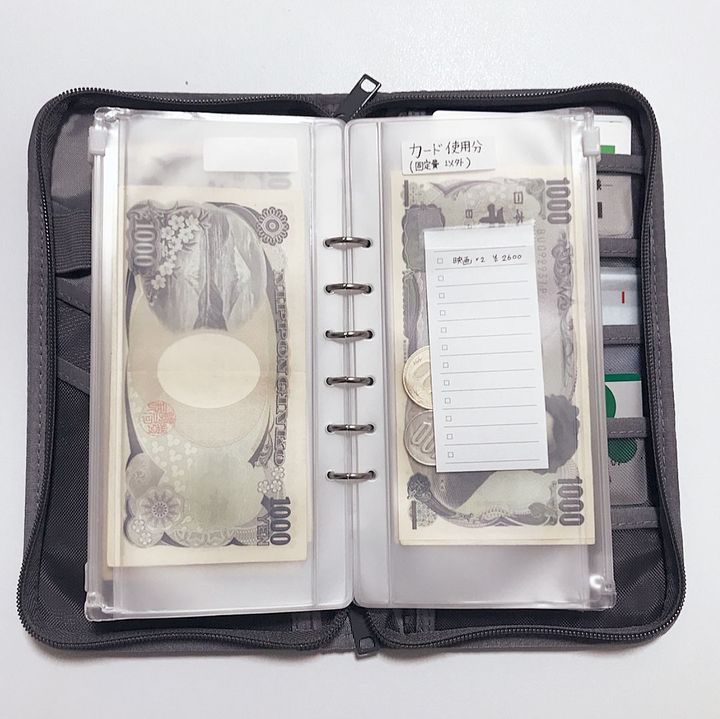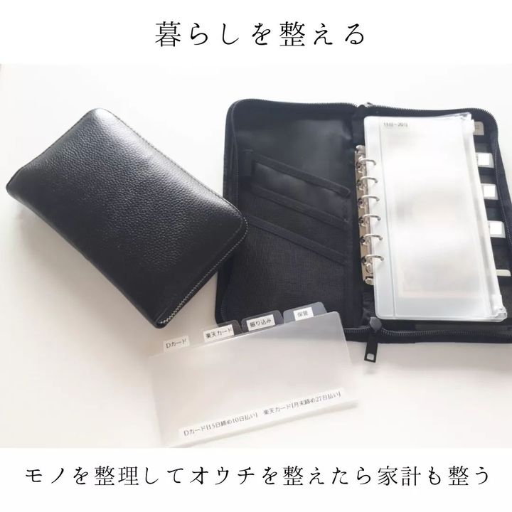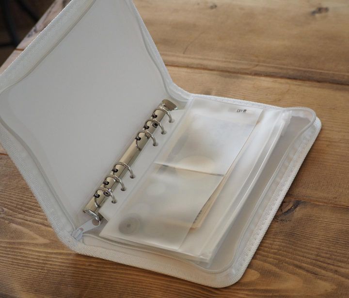「セリア」の「6リングファスナーケース」に専用リフィルのEVAケースをセットするアイデアです。リーズナブルに家計管理用のケースを作ることができますよ。