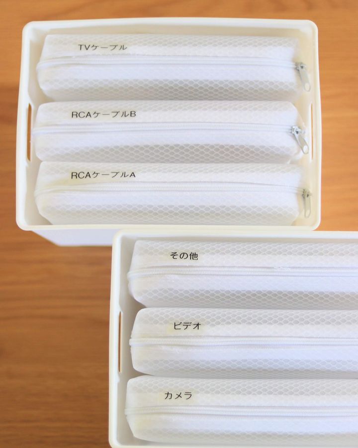 ケーブルなどの付属品と分厚い取扱説明書はA4サイズのEVAケースにまとめて収納。家電の種類ごとにケースを分けておき、ファイルボックスなどに入れておけば、すっきり片付きます。