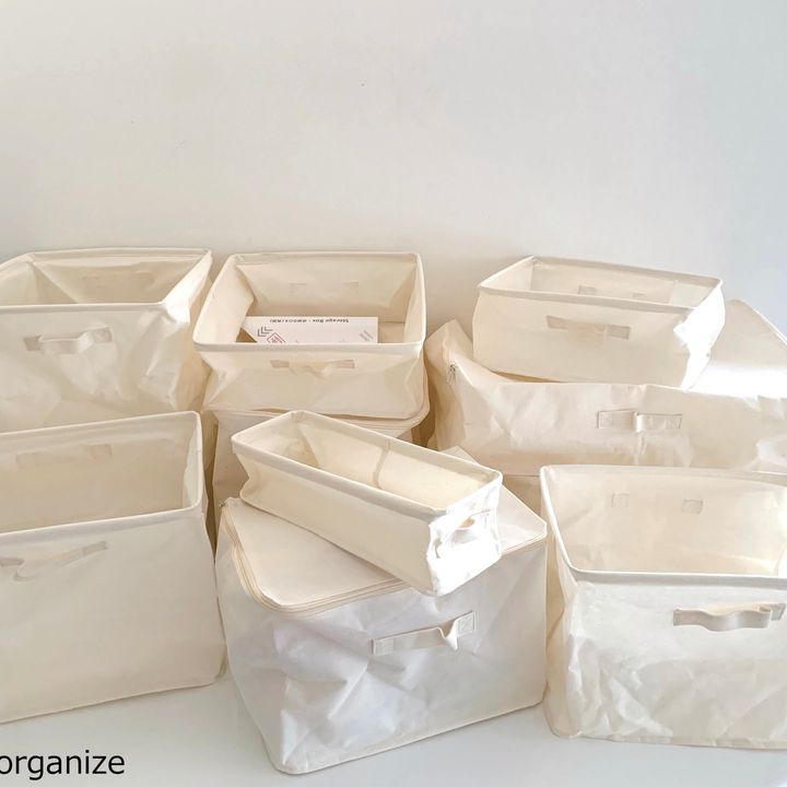 「無印良品」にそっくりな「ダイソー」のシンプル収納ボックスシリーズです。いろいろなサイズがあるので収納したいものやスペースの大きさにあわせて選べますね。