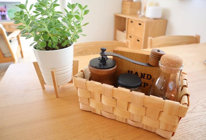 天然素材を使った小さめバスケット。コーヒーミルや豆の保存容器、ドリップフィルターなどをまとめて収納しておくのにぴったりですね。