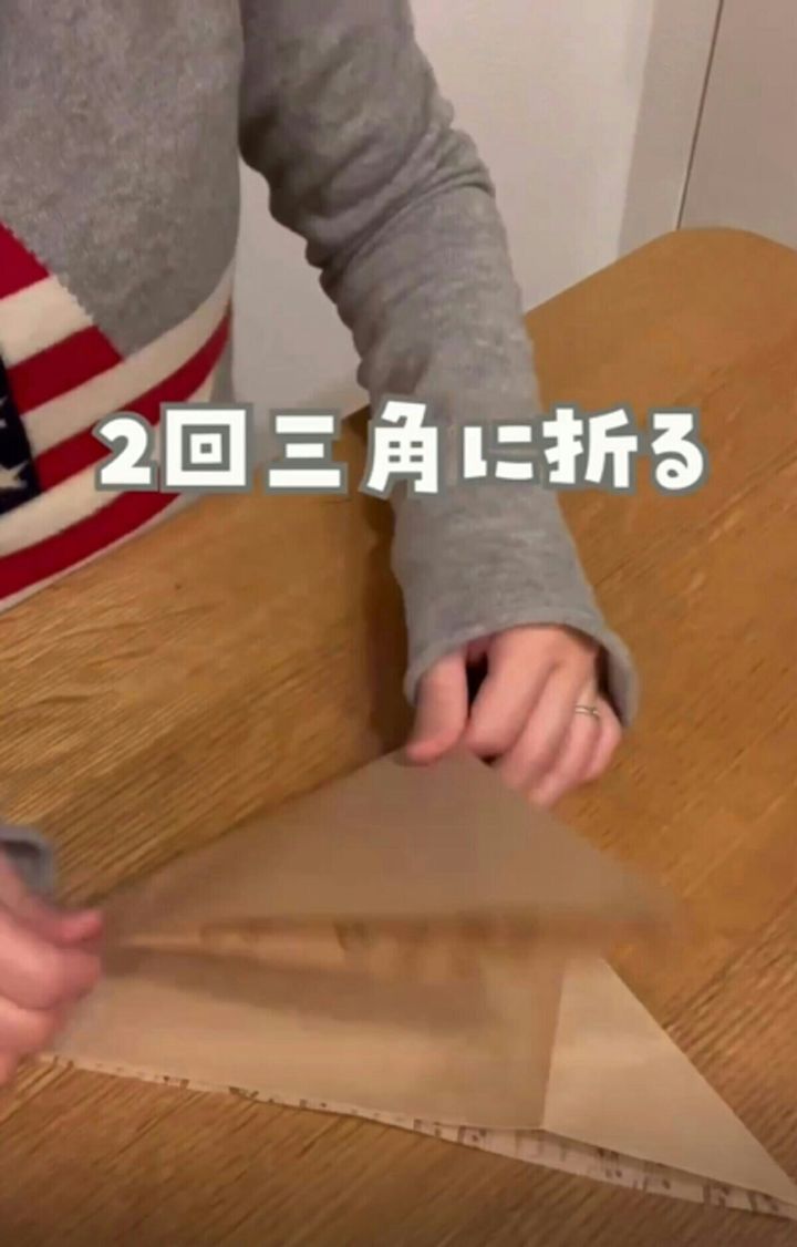 三角に折り、またその三角を半分に折っていきます。2回三角に折るようにしてください。