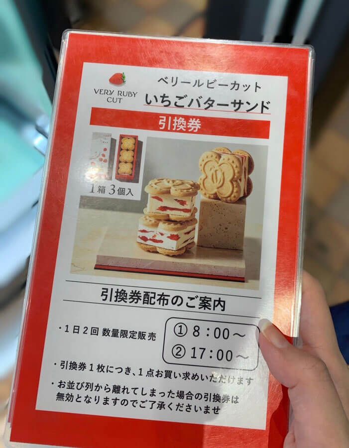 いちごバターサンドは1日に2回、8時と17時から数量限定で販売していて、30分ほど前から引換券が配布されます。私は土曜日に買いに行ったのですが、7時45分には引換券が配布終了、完売となっていました。驚くほどの人気具合です……!