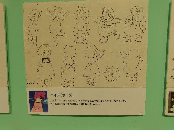 他に、「キャラクター比例表」も展示されていますが、主要キャラクターの身長を比較されていて興味深いです。小さいハイジがアルムの山へ来たのが5歳。51話では、ハイジが成長しています。キャラクターが時間を追って、少しずつ成長する作品は、珍しいですよね!