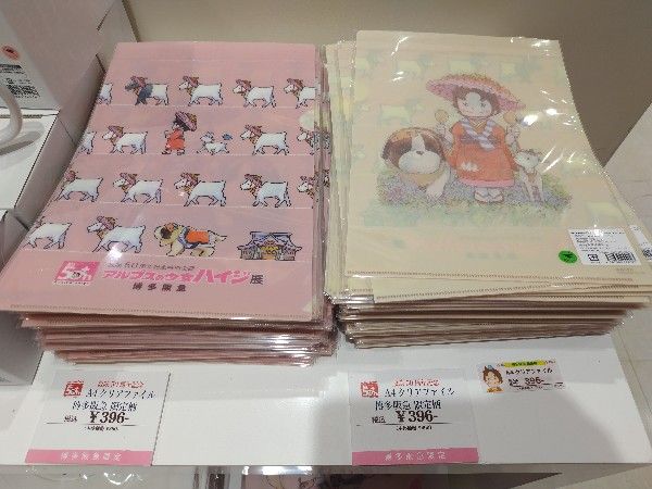 出口の外には、物販や体験コーナー、コラボカフェがあります。 放映50周年記念・博多阪急限定コラボグッズが売っていました。こちらのクリアファイルを購入。どんたくのパレードに参加するハイジとユキちゃんがとても可愛らしいです♡ 他にもTシャツやお菓子など、博多阪急限定グッズが充実していて、嬉しかったです。
