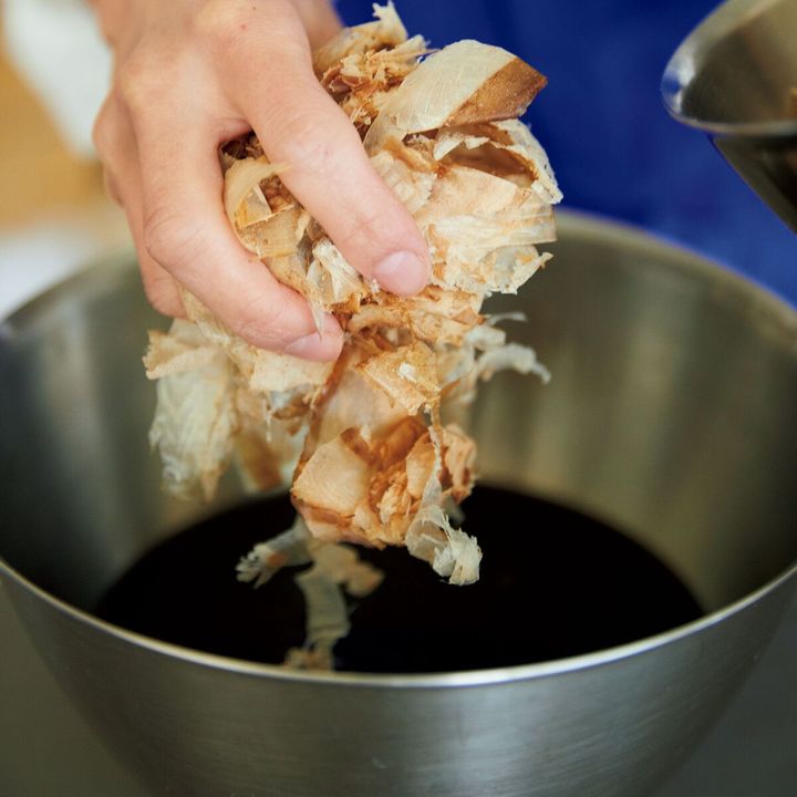 冷蔵庫に一晩じっくり置くことで昆布や削り節からおいしいだしがでます。