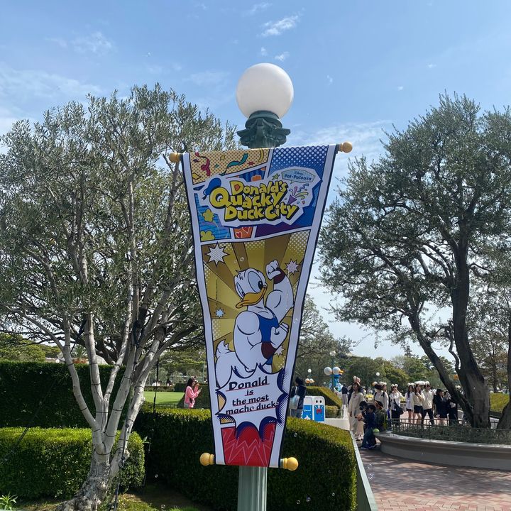 ドナルドの可愛い柄のガーランドが街灯に吊るされています💡