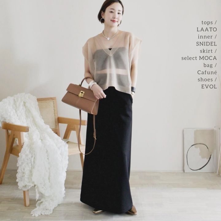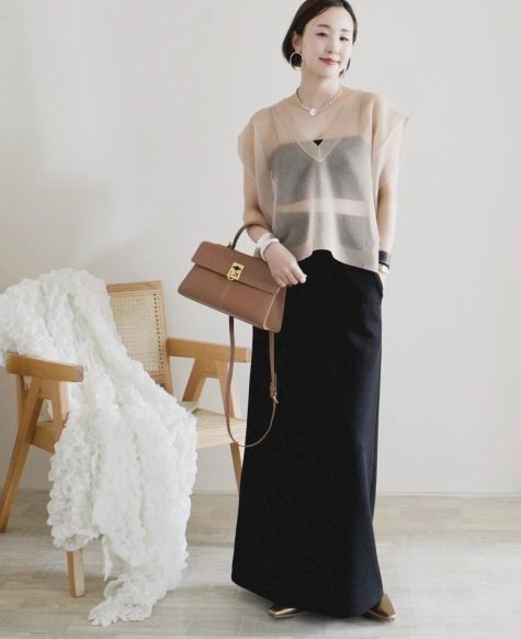 肌なじみの良いベージュの透けトップスは、大人っぽコーデにおすすめです。ブラックのトップス+スカートに合わせるだけで、セクシーな印象に。プレーンなデザインのため、派手すぎず上品さのある着こなしが叶います。バッグはきちんと感のあるデザインを選んで。