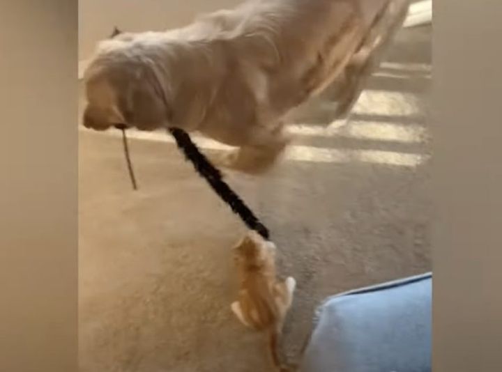3. 猫じゃらしを持ってブンブン!子猫と遊んであげる犬。