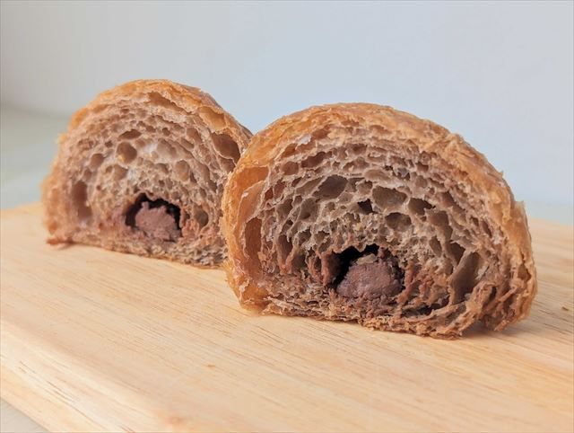 二つに割ると中にチョコレートが……! これがとてもなめらかで、少量に見えるかもしれませんがしっかりとチョコレートの味と甘さが楽しめます。生地に甘みがないので、絶妙なバランスです。