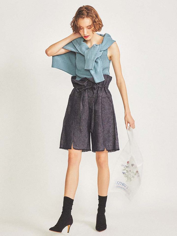 リネン混による独特な素材感の上質なデニム生地。腰位置が高く見えるハイウエスト仕様に加え、広がるように上に伸びるギャザーのおかげで上半身が細く見える効果も。ひざ上丈の幅広シルエットがひざから下の脚を長く見せ、穿くだけでスタイル全体がよく見える優れもの。