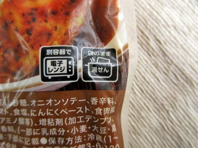 温める前に袋から出してみると、骨付き肉が2本入っています。手のひらサイズで、ボリュームがありそうです。すでにカレーの香りが漂ってきて、食欲をそそります。