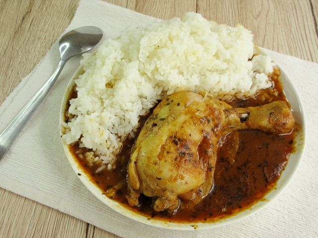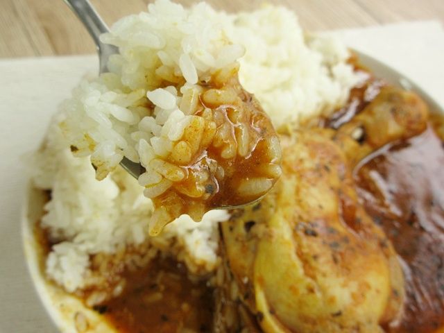 おいしさを保証されたカレー! 辛味の効いたカレーの味わいでスプーンが止まらなくなります。気が付けば……スパイシーな辛さを求めて一心不乱に食べていました。これは悪魔的なおいしさですね。チキンレッグを煮崩して食べれば、一度で二度おいしい贅沢なカレーに早変わりしますよ。