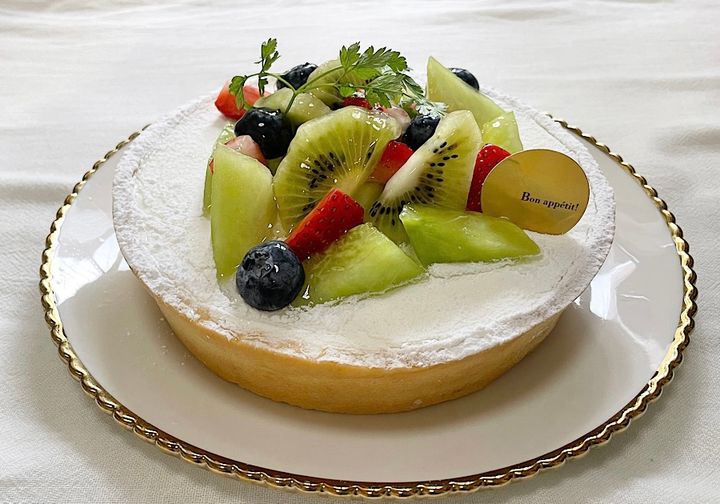 食べてみると、レアチーズクリーム、カスタード入りホイップクリームがとろけるようなやわらかさ。メロンのジューシーで上品な風味が合わさってスッキリさわやかなおいしさを楽しめます。タルト生地は薄めでしっとりとしたタイプ。トッピングがメロンだけでなく、さまざまなフルーツもたっぷりと入っているため満足度抜群。ホールサイズのほか一人用サイズも。こちらは410円で味わえます。