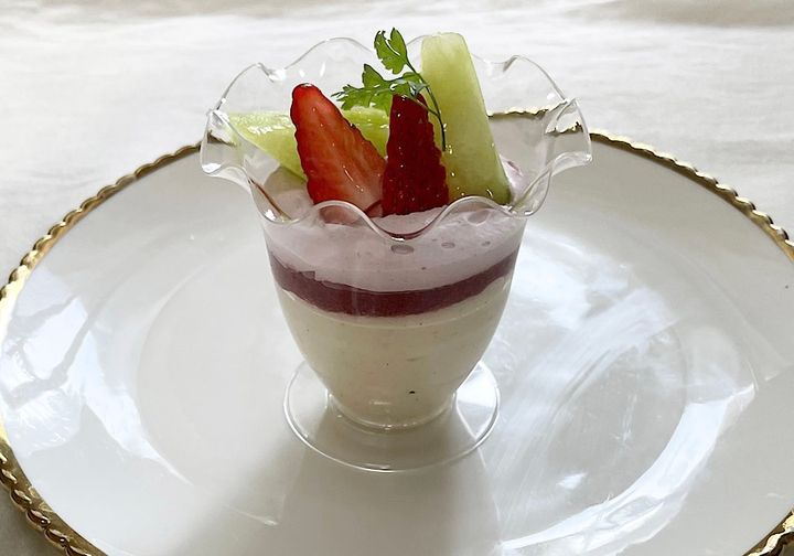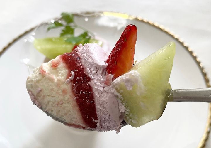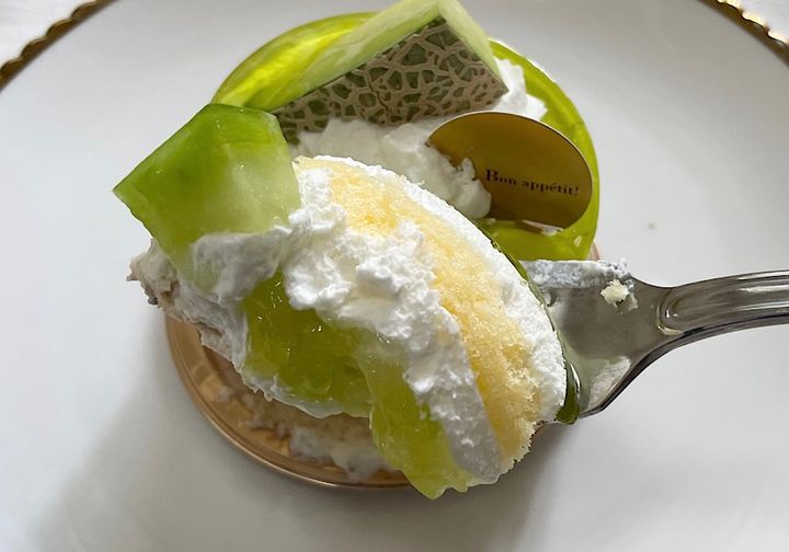 食べてみると、メロンのスッキリさわやかな味わいと、いちごのコンフィチュールとベリームースの甘酸っぱい味わいが相まって、甘みと酸味のバランス絶品! 食べ進めていくと、ほんのりバニラの香りも。筆者は、しっかり冷やして食べるとさらにおいしいなと感じました。いちごととメロンの味わいを一度に楽しめる、贅沢な気持ちになれる一品です。