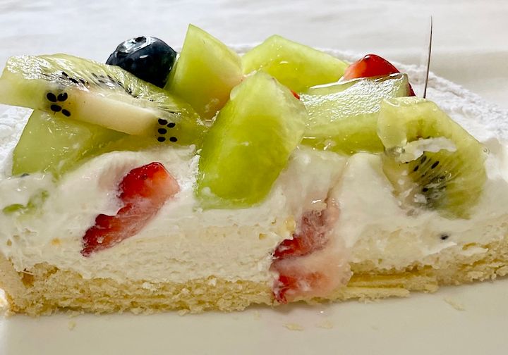 最後に紹介するのは「アンデスメロンのレアチーズタルト」。メロンを存分に楽しみたいならホールケーキもおすすめです。宝石のように散りばめられたカラフルなフルーツにテンションが上がります。メロンを主役に、キウイ、いちご、ブルーベリーをトッピング。レアチーズクリーム、カスタード入りホイップクリーム、スポンジ、タルト生地を層にして作っているのだそう。
