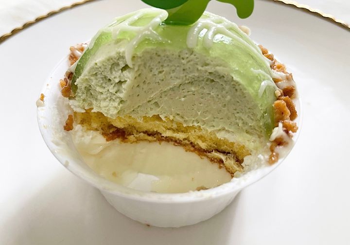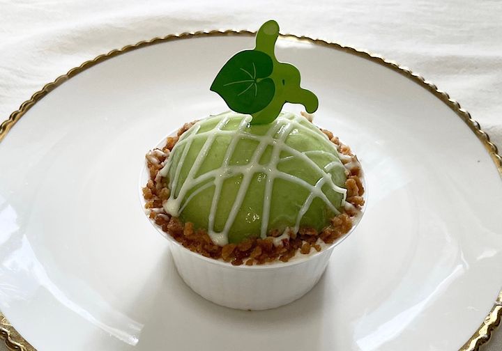 続いて紹介するのは「まんまるメロンケーキ」。メロンカラーとまんまるとしたフォルムがかわいすぎる! こちらも今しか食べられない季節限定品です。ミルク風味のパンナコッタの上にスポンジをのせ、メロン風味のホイップクリームを絞り、赤肉メロン入りのソース、メロンムースをのせて仕上げているのだそう。