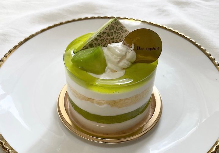 まず紹介するのは「プレミアムフレジェ アンデスメロン」。今が旬のみずみずしい”アンデスメロン”が使用されている『シャトレーゼ』のメロンスイーツです。こちらのプレミアムフレジェは、アンデスメロンの果肉入りメロンソース、スポンジ、ホイップクリームを重ねて仕上げているのだそう。メロンの緑色とクリームの白色が層になっているビジュアルが、美しくて高級感があります。