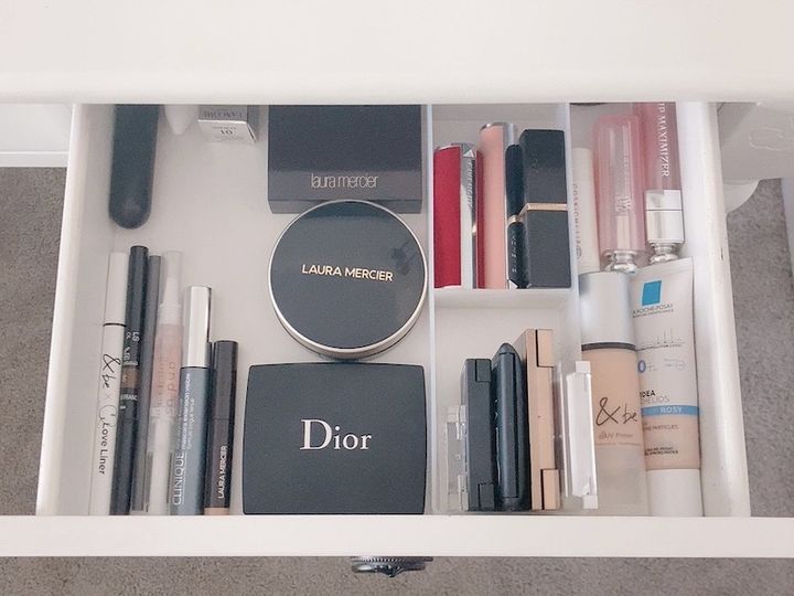 メイク収納は量や収納スペースにもよりますが、できるだけ立てて収納するとスッキリして、使うときにも見つけやすいです。毎日決まったものを使う場合は、毎日使うものをまとめてあげると時短になりますし、日によって使いたいものが違う場合はカテゴリーごとに分類しておくのがおすすめです。