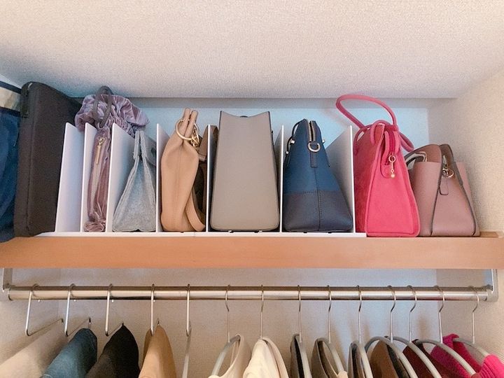 バッグは立てる収納、かける収納、まとめて収納ボックスに入れる方法などがあるので、収納スペースやお好みに合わせて選びましょう。立てる収納はスペースがあってディスプレイのように見せたい場合にはおすすめです。かける収納は比較的省スペースに収まるので、コンパクトな場所に収納したい場合にピッタリ。あまり使わないバッグは収納ボックスにまとめて入れておくと、ほこりもかぶらずスッキリと収納できます。