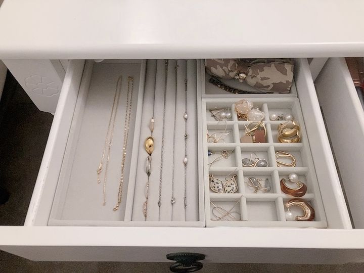 アクセサリーは飾るように収納すると、絡まることもなくなることもなくスッキリ収納できて気分も上がります。お気に入りのものだけを一つ一つ大切に収納してあげましょう。無印良品や100円ショップで購入可能なベロアの仕切りを使うのもおすすめです。