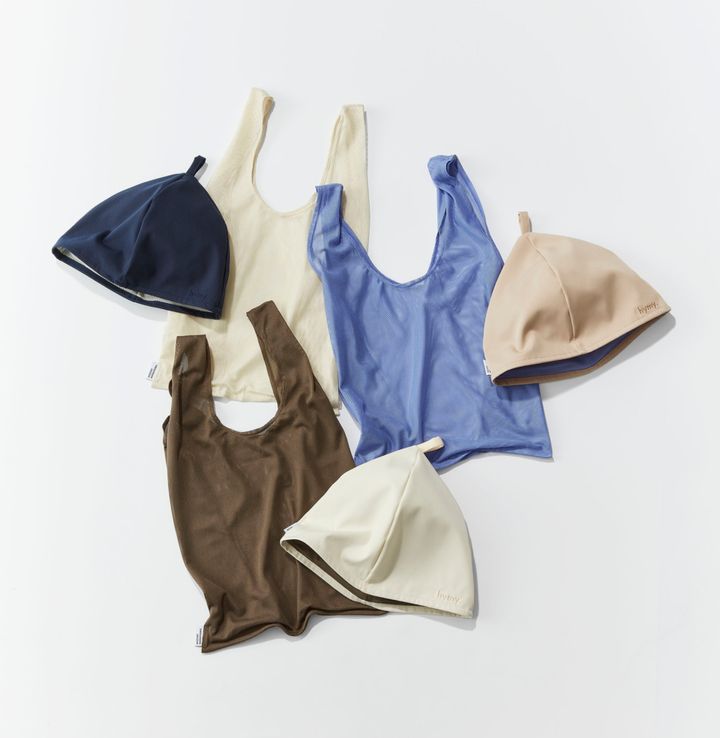 サウナハットとワンピースを着用した花山さん。サウナを知り尽くした彼女ならではのアイデアがたくさん盛り込まれた、こだわりのコラボアイテムが揃います。サウナハット※メッシュバッグとセット¥11,000、スイムウェア¥17,600(共にMIZUKI HANAYAMA×NAVE)