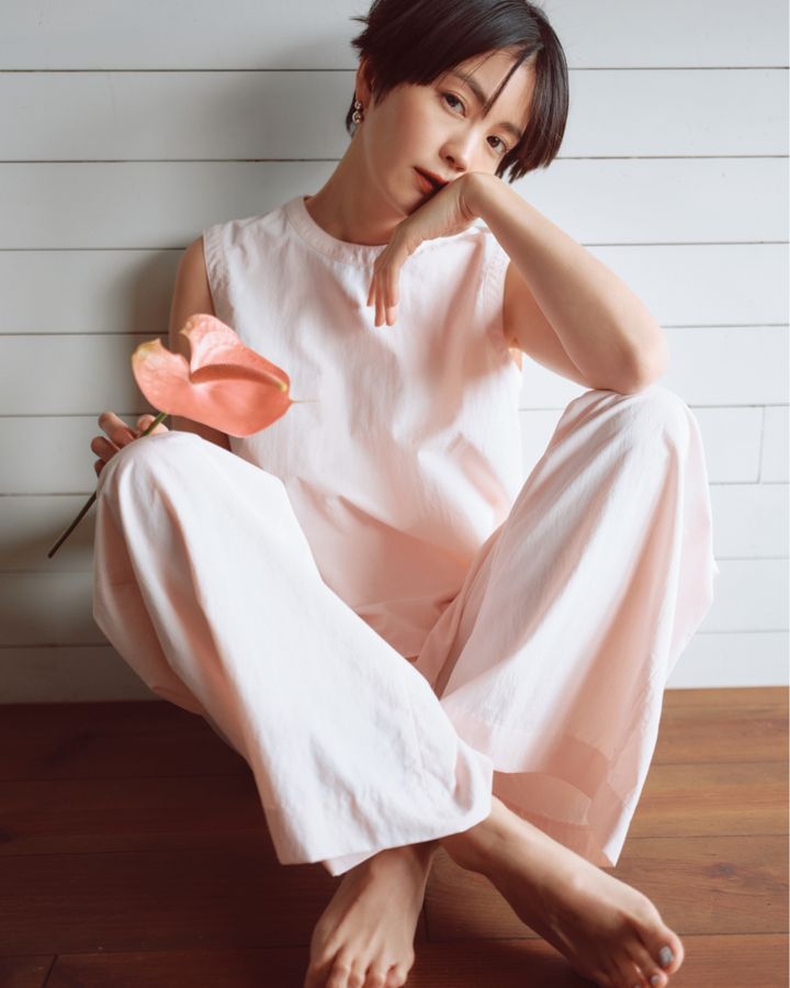 スリーブレスブラウスとタックパンツのセットアップは、オトナミューズコラボの淡いピンクがポイント♡ 撥水、ウォッシャブル、接触冷感、UVケアとこれからの時季に嬉しい高機能素材を使用。ジャンプスーツやシャツ、ドレスも展開。ブラウス¥12,980、パンツ¥19,910(共にNAVE×otona MUSE)