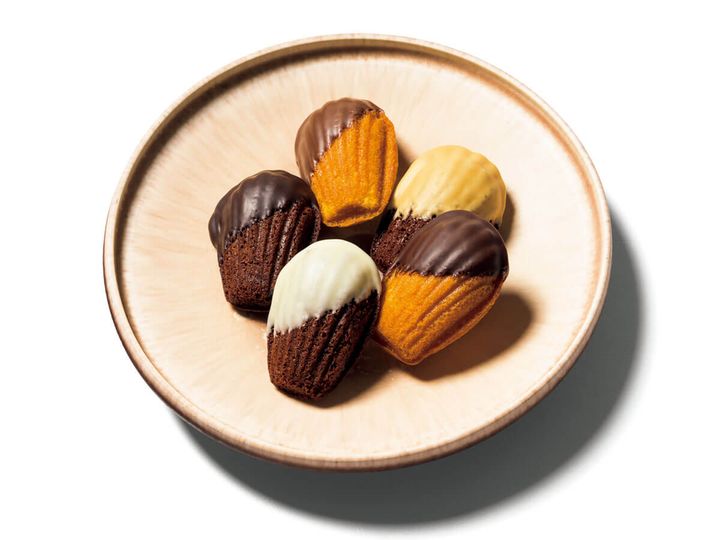 ショコラティエがチョコレートの個性を楽しんでほしいと提案する、チョコレートをディップしたマドレーヌ。生地に最高級のマルコナアーモンドパウダーを使い、バターと卵を極限まで少なくすることでしっとり食感に。バニラとショコラの生地に、カカオ35〜84%までの5種のチョコレートをディップしているので、それぞれの相性を味わう楽しみも。